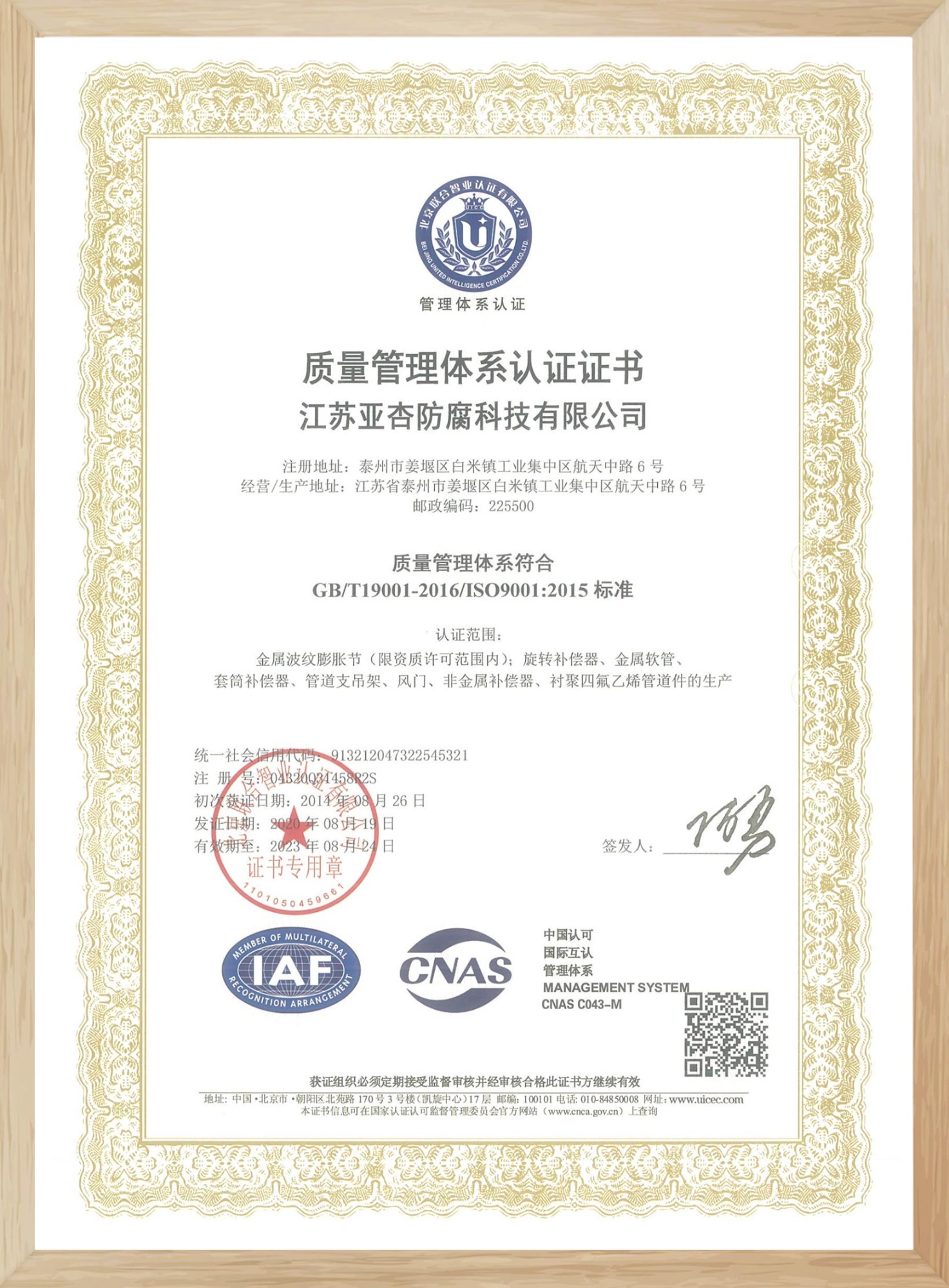 質(zhì)量管理體系認證證書